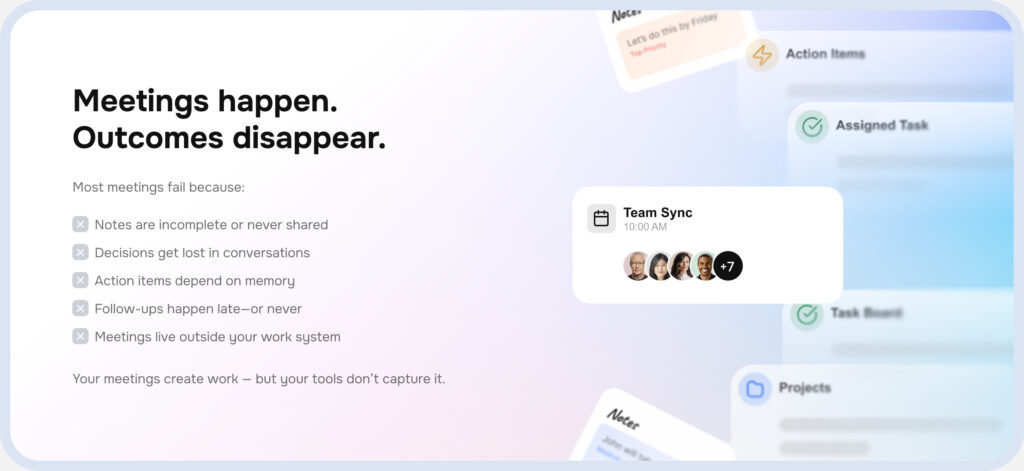 Real-time MoMs, smart task detection, and clear ownership, so everyone leaves the meeting knowing what’s next and who owns it.