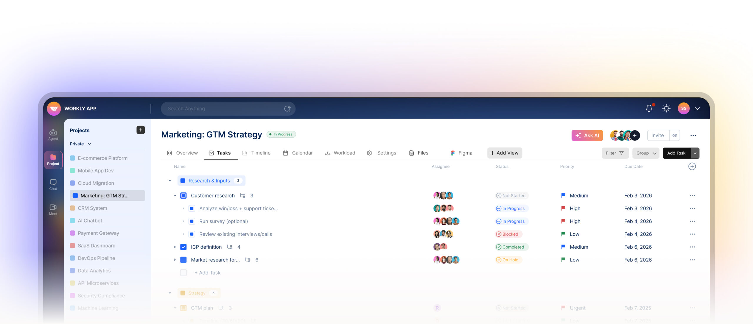 Switch between List, Kanban, Calendar, and Workload instantly — while Workly AI keeps tasks