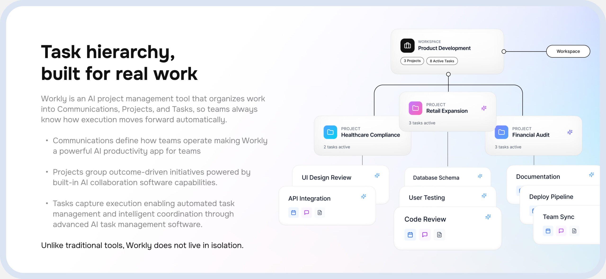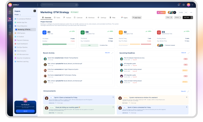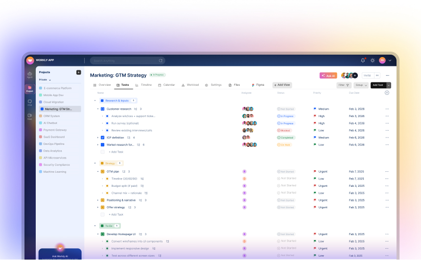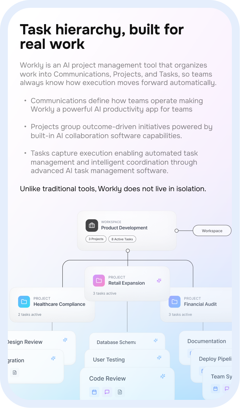 From high-level projects to daily execution, Workly keeps every task connected and moving.