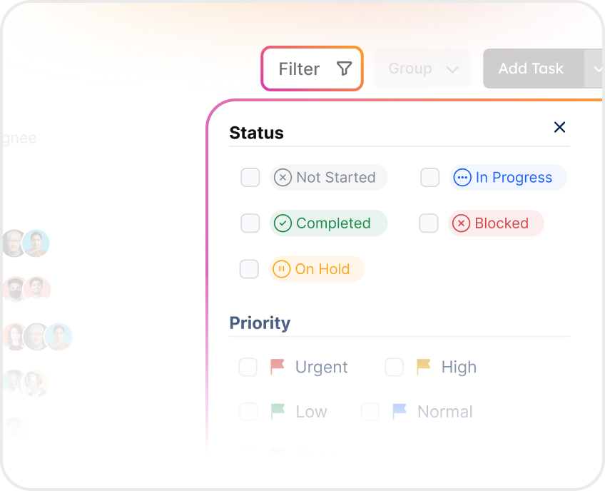Filter by status, owner, or priority to quickly identify blockers and risks.